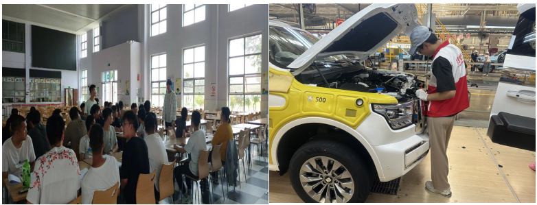 在长城汽车股份有限公司荆门分公司,郭老师走访了总装车间、焊装车间,并与各车间负责人交流,了解学生情况,随后,组织学生开展座谈。郭老师询问学生在岗位上实习时是否遇到困难,并了解学生实习岗位适应情况和专业知识掌握情况。指导学生要积累和凝练校外课堂的实践技能和案例,将其融入到后续校内课堂学习中,真正做到学中做、做中学、从实践中来、到实践中去,并强调,专业实践学习是大家走向工作岗位中实践经验积累的重要环节,也是大家在步入工作岗位前积累实践经验的最好时机,希望同学们抓住并且珍惜此次校外课堂的学习机会,将理论知识带到实践中去,真正做到学以致用。