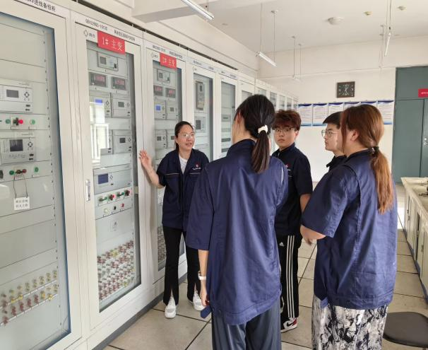 汝晓艳老师在了解了学生出勤情况、实习手册填写情况之后,听取了部分学生对近阶段实习内容的介绍及实习感悟。汝晓艳老师在该公司的变电所,结合变电站的结构、功能,为学生讲解了交流电路的功率计算和测量,变压器的继电保护原理,指导如何对变压器保护测控柜的数据进行检测,如何应对突发情况,保证机器正常运行。