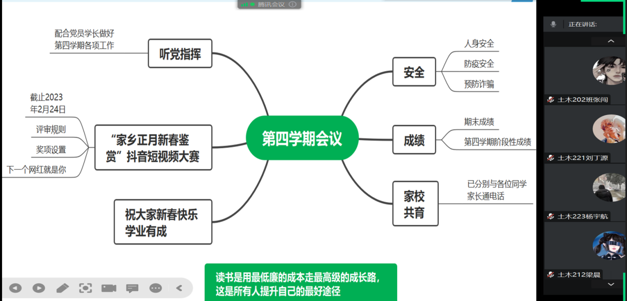 为了让学生能按时顺利完成第四学期各项任务,我召开了三次阶段性总结指导会;参与辅导员及专业长组织的八次会议并及时将会议精神进行传达;鼓励学生参加省科协组织的青年科普创新实验暨作品大赛,目前已有八人报名参赛;及时与所有生涯学生家长电话沟通,达到家校共育促进学生成长的效果;第四学期活动过程中,我带领学生一起完成工作任务,这既是督促,也是提醒,更是为了让学生养成良好的习惯。通过以上方式的指导,所有学生的各项任务都已顺利完成。
