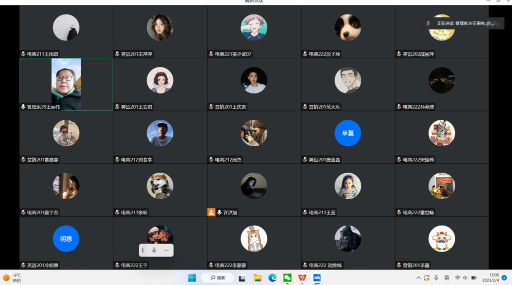 为了解同学们第四学期的进展情况,更好地督促学生完成第四学期任务,2月4日15时,管理工程系各专业年级9个班级的第四学期中期汇报会在线召开。辅导员王丽伟老师进行点评,许洪旭同学主持。会上,汇报小组认真将第四学期中期任务成果进行了总结,并对后期进程进行了合理的规划。王丽伟对汇报的小组进行了客观点评,督促同学们认真完成任务,留存好照片,希望同学们跟进时代前进的步伐,了解非遗文化,关心国家大事,在假期坚持练字并做有意义的事情,做一个善于观察、善于聆听的新时代青年,并提醒同学们调整好状态,并做好开学的相关准备。本次会议抽取小组汇报,不仅让各小组将第四学期的中期任务成果得到展示,而且让各小组之间得到充分交流与学习,同时加强了各小组成员对第四学期任务的理解与重视。