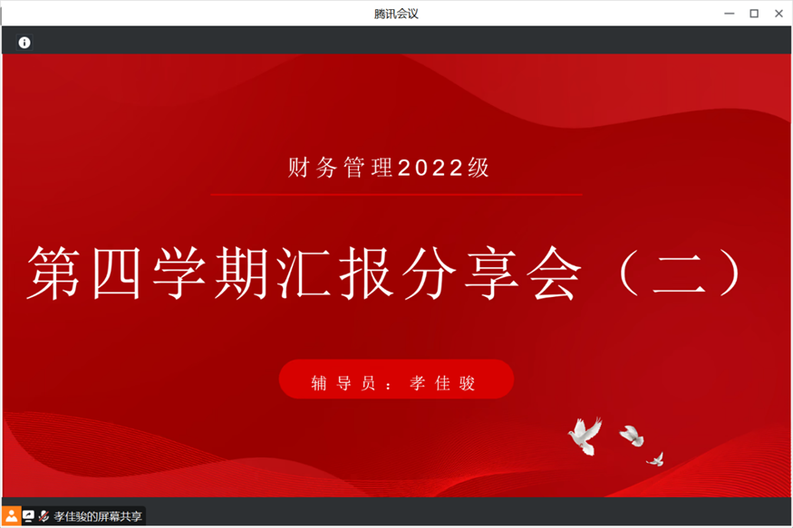 为了进一步了解学生的第四学期学习进展,切实培养学生的“三五能力”,财务管理专业2月3日在线开展了第二次“第四学期汇报分享会”。该专业全体同学参加,财管223班董策同学主持。首先,辅导员孝佳骏对汇报提出要求。随后,同学们以自己的第四学期实践进行分享;财管221班孙欣雨同学以图片的形式分享了自己的假期生活。最后,辅导员孝佳骏对本次会议进行总结,提出了相关建议,同时对学生们的第四学期专业项目进展提出了进一步的要求。通过本次“第四学期汇报分享会”的开展,进一步提高了第四学期项目完成效率,同时为接下来的第四学期实践报告总结打下了良好的基础。