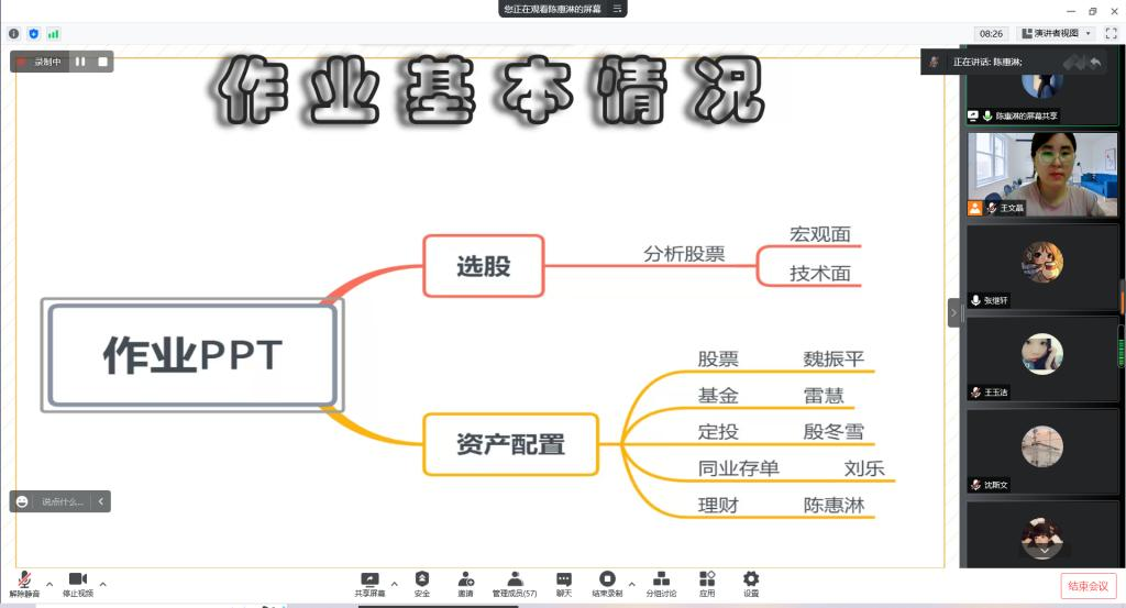 首先,由中国银河证券齐齐哈尔龙华路营业部实习的陈惠淋同学从实习岗位的任务、在实习工作中的不足、作业完成情况、实习计划四方面进行汇报。