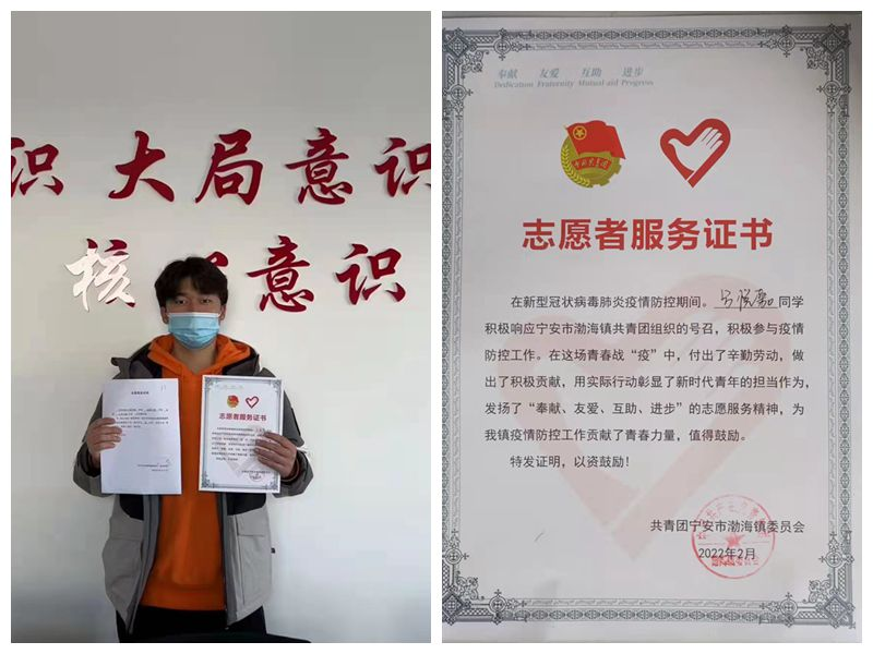 近日,建筑工程系第四学期社会实践 JZSXQ57组土木工程专业学生吕悦嘉因在防疫防控志愿服务中表现突出,获得共青团宁安市渤海镇委员会的志愿者服务证书。