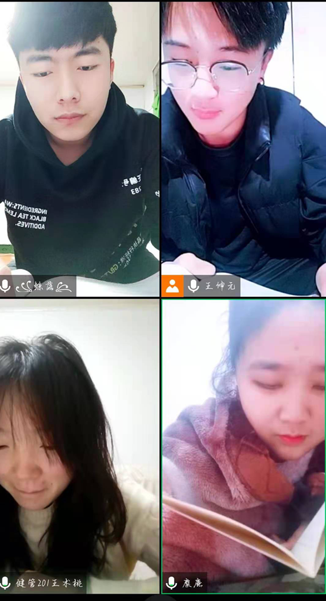 1月17日14时,为响应学校号召,积极参与第四学期实践活动,GY-176小组成员电气本201王伸元、财管203付国华、健管201华紫茹和健管201王术桃四人在腾讯会议中开展了以“书香校园”为主题的线上交流活动,就自己在图书馆所借书籍阅读后心得体会进行交流探讨。