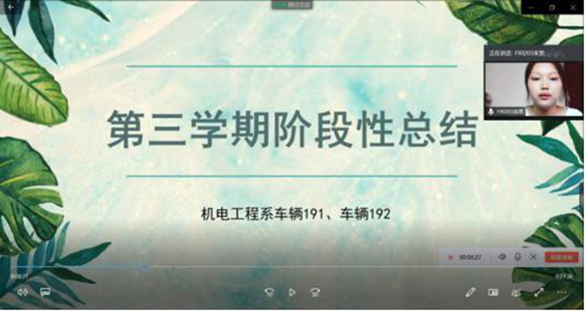 车辆191班学委单成瑞、车辆192班朱雯同学分别汇报第三学期以来的实习情况,主要是学生组队运用CAD软件绘制图纸,还有去企业实习和自主创业等,同学们都有了成长与收获。车辆192班周承霖同学讲述,在第三学期选择组队运用CAD 制图,团队的集体学习、讨论和动手操作,是自己最喜欢的一种实训方式,锻炼增强了自己的“五种能力”。