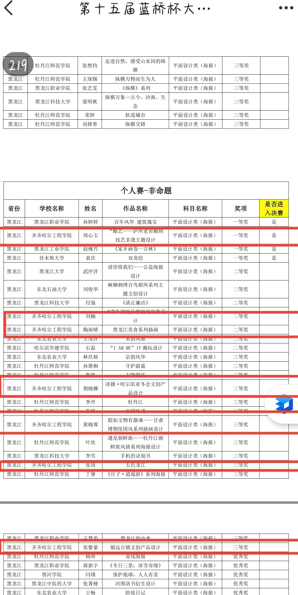 近日,第十五届“蓝桥杯全国软件和信息技术专业人才大赛”视觉艺术设计黑龙江赛区获奖名单公布,信息工程系视觉传达设计专业学生在大赛中取得优异成绩。在本次赛事中,孙莹莹、周志明、李宇轩三位同学获得个人赛命题赛道黑龙江赛区一等奖,成功进入国赛。李芳芳、印梦琪、徐涵、冷如茂四位同学获得个人赛命题赛道黑龙江赛区二等奖;隗英莺、董雨欣、张舒雅三位同学获得个人赛命题赛道黑龙江赛区三等奖。另外,周心玉同学获得个人赛非命题赛道黑龙江赛区一等奖,成功进入国赛。刘楠、陶雨晴两位同学获得个人赛非命题赛道黑龙江赛区二等奖,荆晓娜、黄晓蓉、张琦、张紫豪三位同学获得个人赛非命题赛道黑龙江赛区三等奖。共计17位同学在本次赛事中获得奖项。