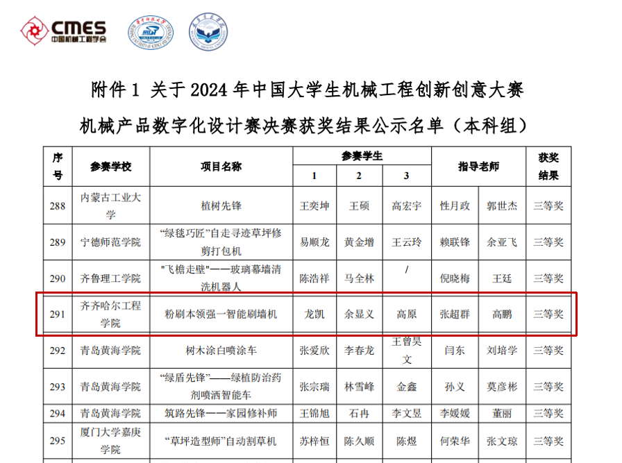 近日,2024年中国大学生机械工程创新创意大赛机械产品数字化设计赛决赛传来喜讯,我校机电工程系机械设计制造及其自动化专业学生龙凯、余显义、高原的项目“粉刷本领强—智能刷墙机”,在比赛中荣获全国三等奖。