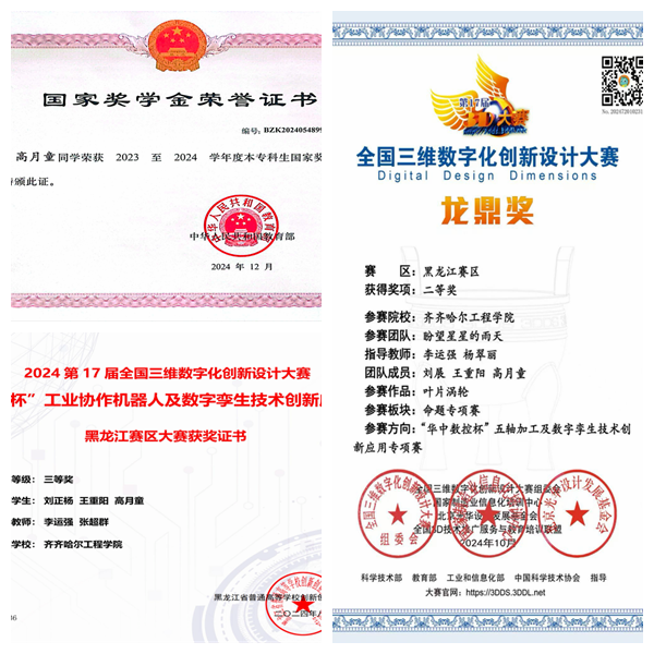 “学生的第一要务是学习”——这是高月童的座右铭。她连续三年学习排名专业前1%,获得国家奖学金、国家励志奖学金、校级一等奖学金等;参加中国国际大学生创新大赛黑龙江省赛区荣获铜奖;获全国三维数字化创新大赛“华中数控杯”工业协作机器人及数字孪生技术创新应用专项赛黑龙江省赛区三等奖、全国三维数字化创新大赛“华中数控杯”五轴加工及数字孪生技术创新应用专项赛黑龙江省赛区二等奖等。她主动担任“学业帮扶小导师”,为班级同学定制学习计划,与同学们共同进步。