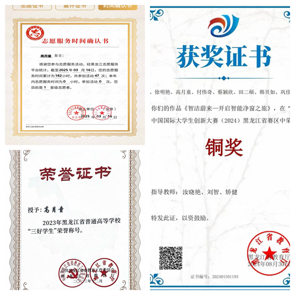 高月童积极参加学校组织的社会实践学期和专业实践学期,认真完成各项任务,荣获2022—2023、2023—2024年度社会实践学期优秀学生称号,2023—2024年度专业实践学期优秀学生称号。日常生活中,她积极参加志愿服务活动,三年来,累计志愿服务达180余小时,她用无私奉献诠释着青春最美的模样。