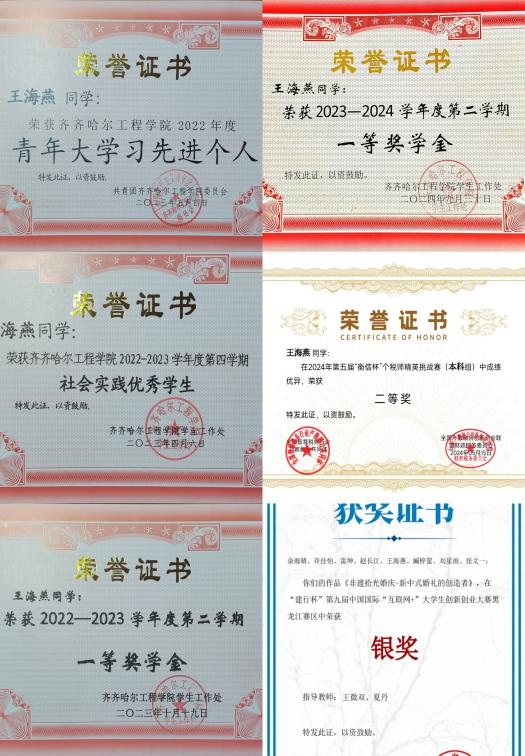王海燕,女,建筑管理工程系财务管理专业2021级学生,任班级学习委员。王海燕始终保持着积极向上的心态,以高标准严格要求自己,先后获得2023-2024学年度学校一等奖学金两次、第九届中国国际“互联网+大学生创新创业大赛”黑龙江赛区银奖、第五届“衡信杯”个税师精英挑战赛(本科组)二等奖校级“优秀学生干部”“青年大学习先进个人”“专业实践学期优秀学生”等荣誉。