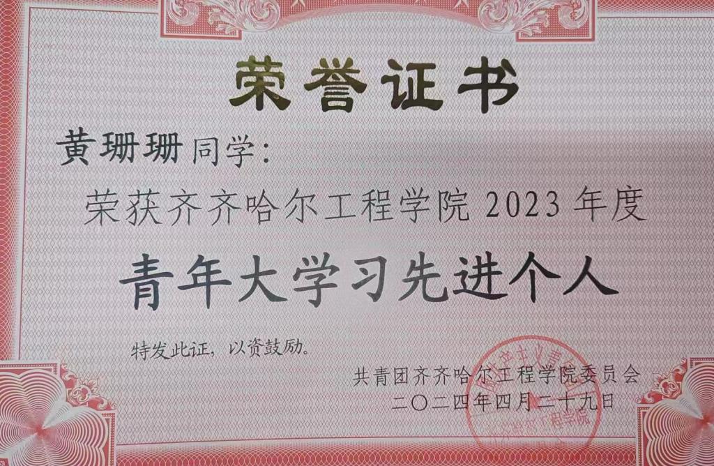 黄珊珊在思想上始终保持积极进取的态度,她深知理论学习的重要性,不仅认真参加思想教育活动,还主动通过多种渠道加强理论学习,不断提升自身的思想修养。在生活中,她更以实际行动发挥带头作用,积极带动身边同学共同进步,并荣获乐投app官方在线入口 2023 年度“青年大学习先进个人”称号。