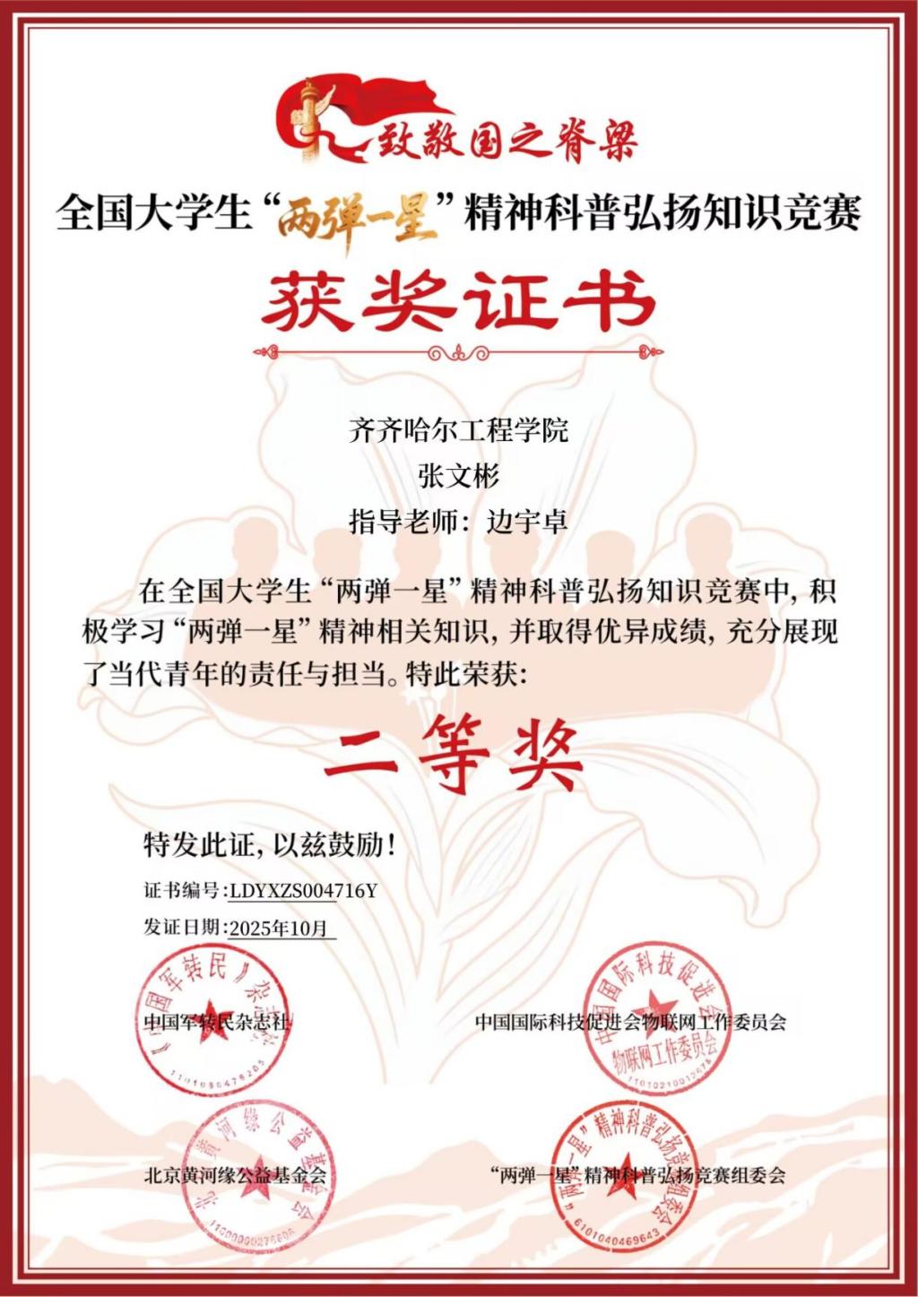 竞赛以“传承红色基因、弘扬科学精神、勇担时代使命”为宗旨,与课程思政育人理念高度契合。物理教研室将赛事作为深化思政教育的重要载体,赛前组织学生解读“两弹一星”研制历程中的关键物理原理、技术突破等科普知识,深入宣讲钱学森、邓稼先等老一辈科学家以身许国的爱国事迹,系统阐释“热爱祖国、无私奉献,自力更生、艰苦奋斗,大力协同、勇于登攀”的精神内核。比赛中,我校学子凭借扎实的知识储备和深厚的爱国情怀,经过激烈角逐,最终取得佳绩。
