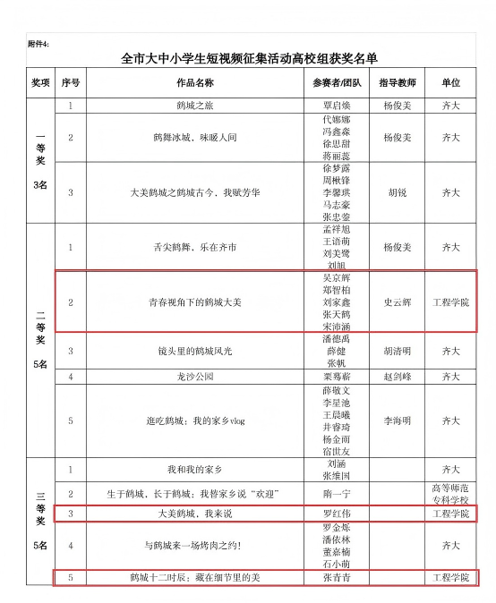 近日,中共齐齐哈尔市委教育工作委员会公布“大美鹤城我代言”全市大中小学生短视频征集活动评选结果。我校学子以新颖的创作思路和深厚的家乡情怀,在高校组评选中表现突出,荣获多项奖项。其中,信息学院吴京辉团队作品《青春视角下的鹤城大美》获二等奖;土木与管理学院罗红伟的作品《大美鹤城,我来说》、信息学院张青青的作品《鹤城十二时辰,藏在细节里的美》获三等奖。