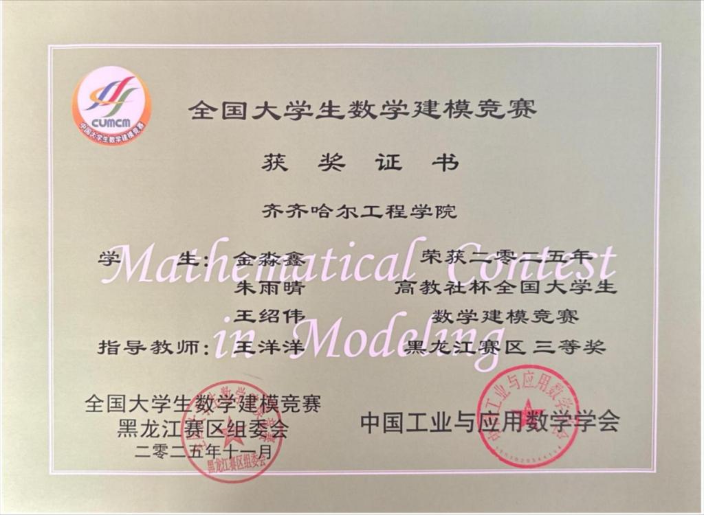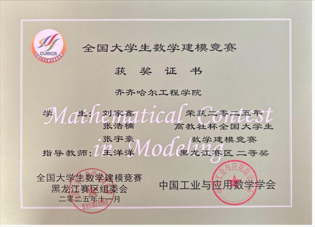 近日,全国大学生数学建模竞赛黑龙江省赛区获奖名单揭晓。我校学子在激烈角逐中脱颖而出,共荣获省级二等奖1项、三等奖2项,充分展现了学校学生扎实的数学基础、严谨的逻辑思维、出色的团队协作与创新能力。