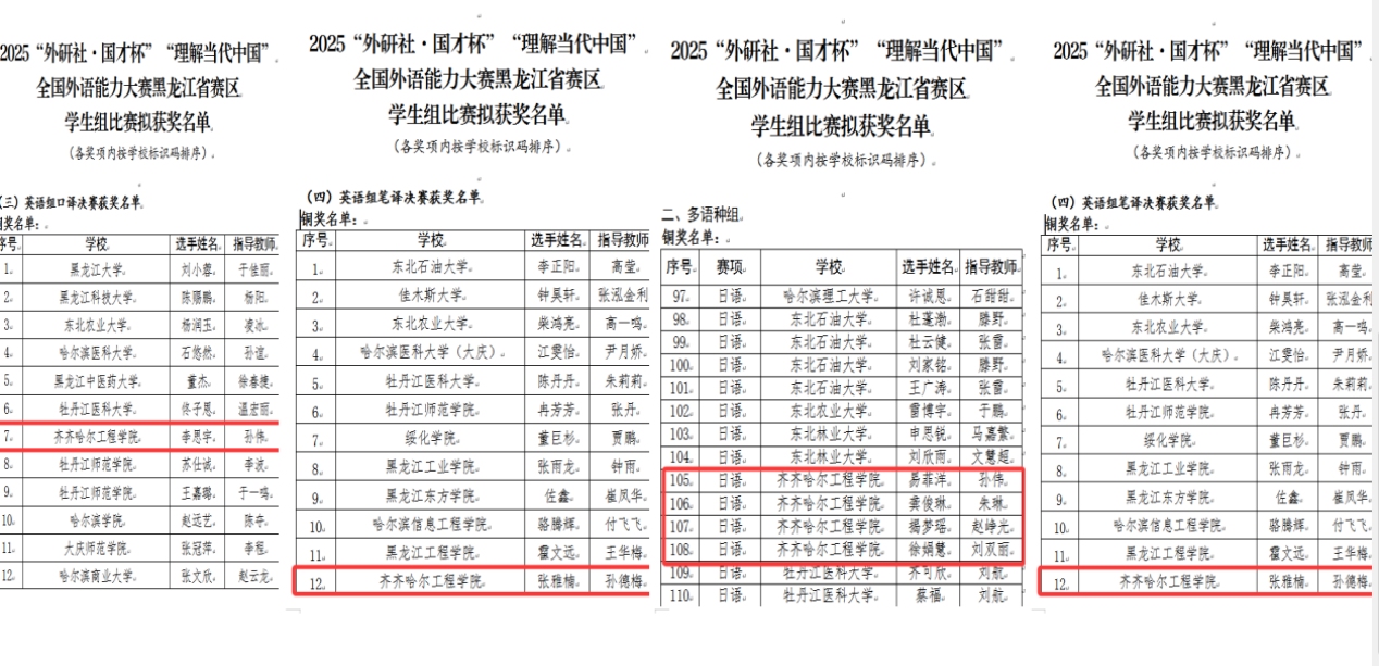 “外研社·国才杯”系列赛事是教育部认可的84项全国大学生学科竞赛之一,由北京外国语大学主办、外语教学与研究出版社承办,是国内最具权威性和影响力的外语赛事之一。该比赛已连续四年被纳入中国高等教育学会发布的“全国普通高校大学生竞赛排行榜”,其获奖成果广受社会认可。本次比赛黑龙江省赛区共有39所高校、10个外语语种专业的23020名学生参与校级选拔,经过角逐,最终1088名选手晋级省级决赛。我校师生在激烈的竞争中脱颖而出,取得佳绩。
