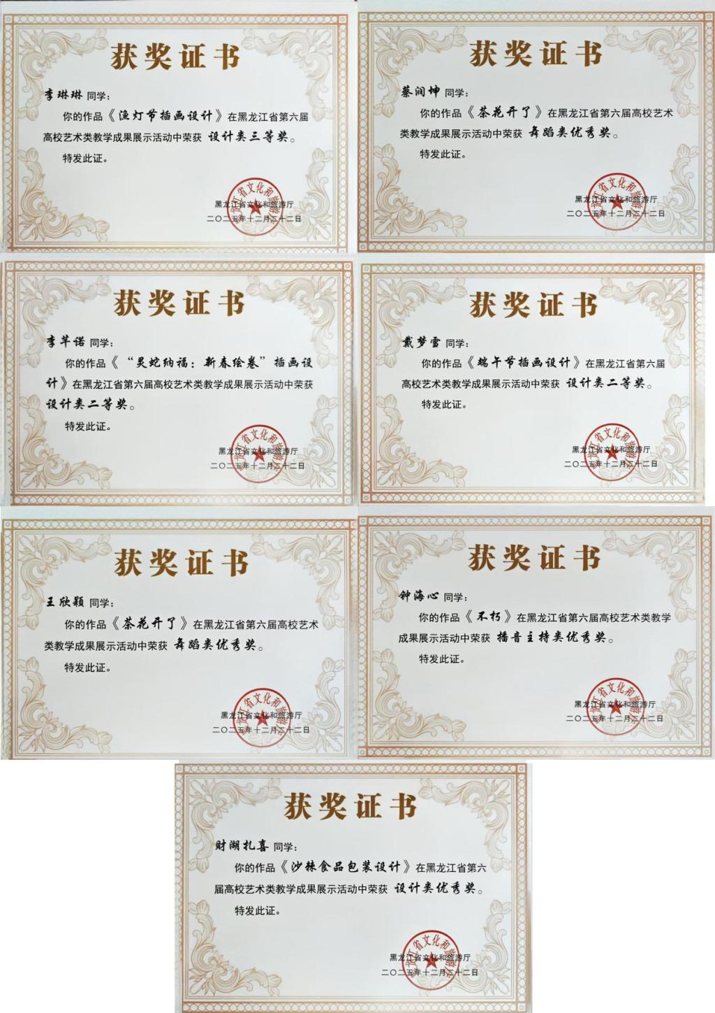 近日,黑龙江省文化和旅游厅印发《关于印发黑龙江省第六届高校艺术类教学成果展示活动获奖节目和作品名单的通知》。学校艺术与体育学院师生凭借扎实的专业功底与新颖的创作理念,在本次活动中斩获佳绩,共荣获一等奖4项、二等奖3项、三等奖2项、优秀奖7项。此次获奖数量与等级均创学院参赛以来历史新高,充分展现了学校艺术教育的扎实成效与丰硕成果。