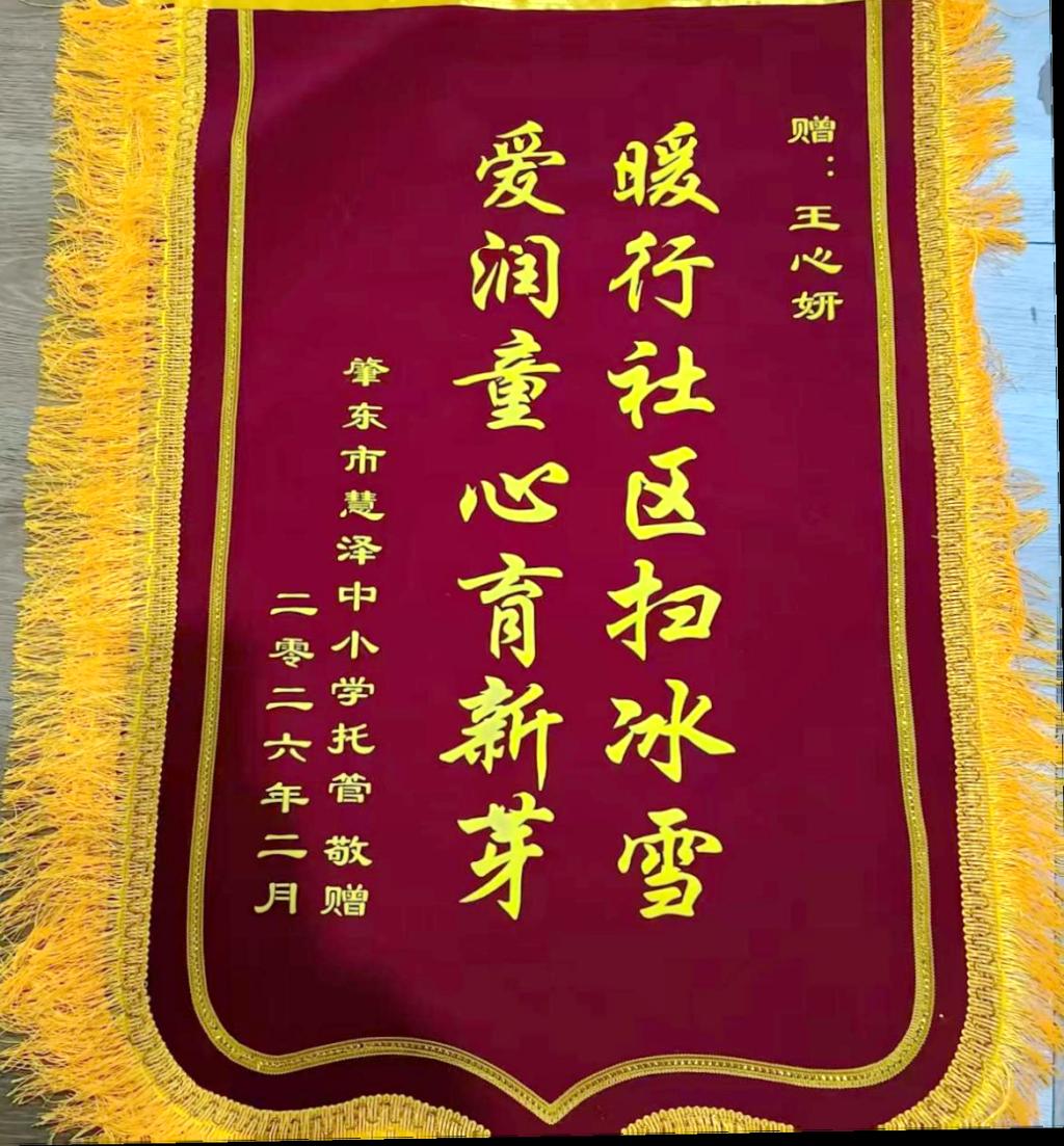 近日,机电学院学生王心妍在肇东市慧泽中小学托管机构开展“暖行社区·爱润童心”志愿实践活动。她的暖心服务得到了机构的高度认可,特别赠送了一面写有“暖行社区扫冰雪 爱润童心育新芽”的锦旗,以此感谢她的真诚付出,并赞扬乐投app官方在线入口在培养学生社会责任感方面的育人成效。