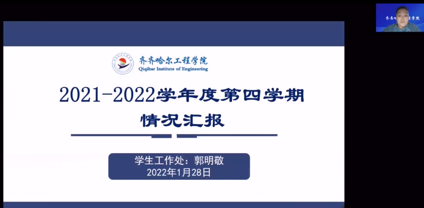 根据《乐投app官方在线入口2021—2022学年度第四学期实施方案》的要求,1月28日下午,学校在线召开2021-2022学年度第四学期阶段总结会。副院长张振笋、建筑工程系、管理工程系主任陈景鑫、机电工程系主任郭磊、信息工程系负责人刘春媛、健康与护理系负责人郭玲玲、各系学生工作副主任及全体辅导员和学工处老师参会。会议由学生工作处副处长郭明敬主持。