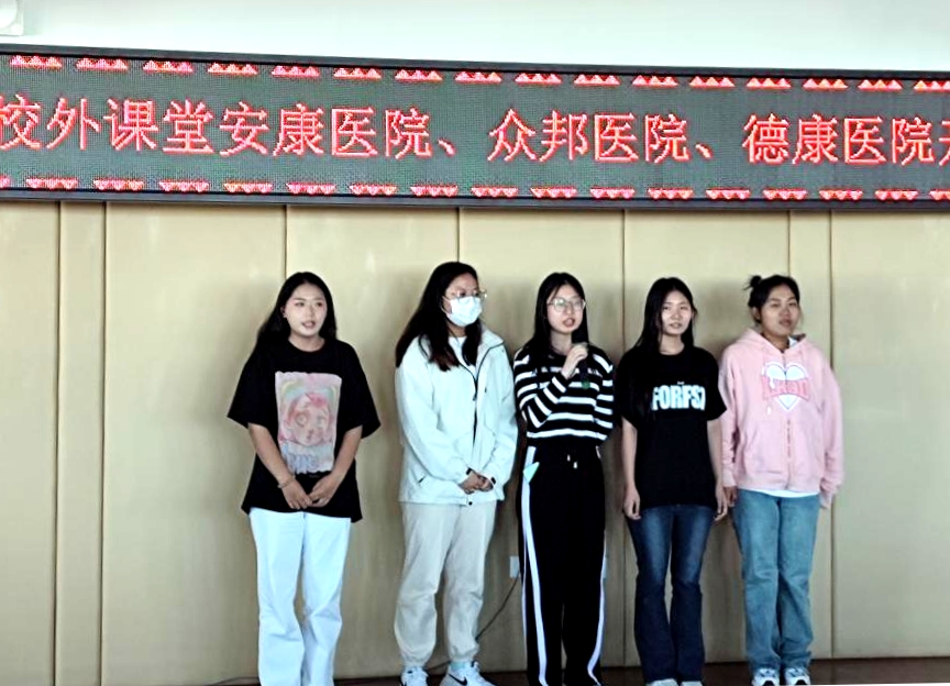 三个校外课堂班级的学生分别前往安康医院、众邦医院和德康医院实习,开班仪式上学生们斗志昂扬地喊出出征口号。