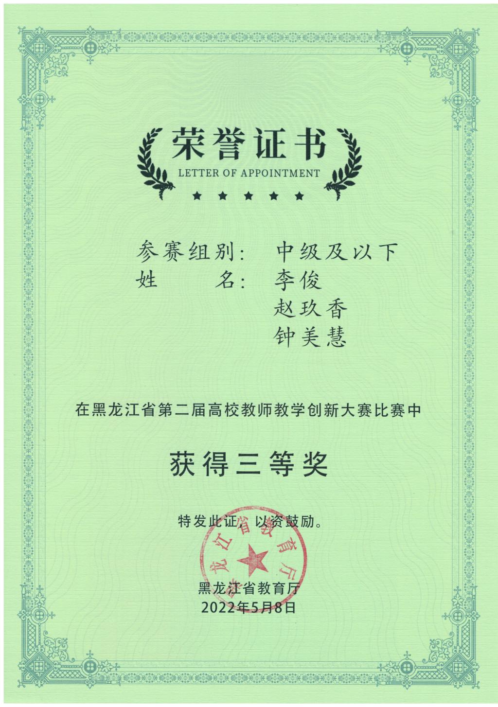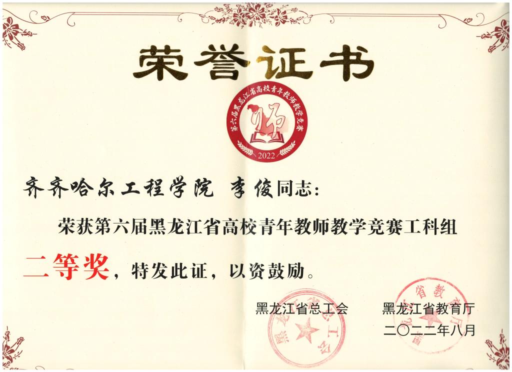 李俊老师在2021年,荣获第八届黑龙江省高校青年教师多媒体课件制作大赛三等奖;2022年荣获第九届黑龙江省高校青年教师多媒体课件制作大赛一等奖;2022年荣获第六届黑龙江省高校青年教师教学竞赛二等奖;第二届黑龙江省高校教师教学创新大赛三等奖;参与的基于FT课程建设理念的《土木工程材料》课程“三四三”教学模式构建与实践》荣获黑龙江省教学成果二等奖;