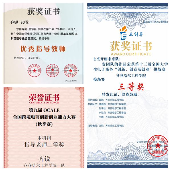 为了帮助学生提高专业技能,提升未来就业竞争力,齐锐老师和专业教师寻找各方竞赛资源,组织学生参赛,鼓励学生参加跨境电商等大赛,在全国高校商业精英挑战赛国际贸易竞赛备赛中,齐锐老师和学生一起研究比赛规则,引导学生深入了解跨境电商的行业趋势和运营模式,帮助学生制定了切实可行的商业计划,陪伴学生进行一次次模拟练习,在比赛过程中,时刻关注着学生的进展,及时给予指导和建议。最终,学生凭借出色的表现获得了全国总决赛三等奖的优异成绩。她指导的生涯学生在各类竞赛中屡获殊荣,例如第三届全国高校商务翻译(英语)能力挑战赛三等奖、第五届BETT全国商务英语翻译大赛三等奖、2023年全国高校商业精英挑战赛国际贸易竞赛“颜值立方杯”跨境电商赛道全国总决赛三等奖、第十三届大学生职业规划大赛校级决赛就业赛道一等奖。这些荣誉和成绩的背后,是生涯导师和学生们共同的努力和坚持。