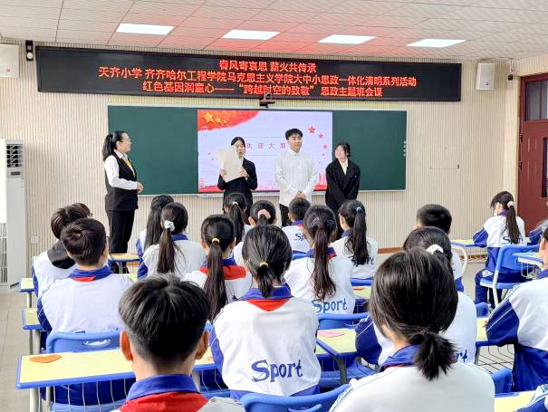 为深入贯彻落实立德树人根本任务,扎实推进大中小学思政课一体化建设走深走实,3月30日,学校马克思主义学院走进天齐小学,开展“春风寄哀思,薪火共传承”主题教育活动。马克思主义学院院长赵婷婷,铁锋区教师进修学校德育部副主任王微,天齐小学相关校领导及我校师生代表共同参加本次活动。