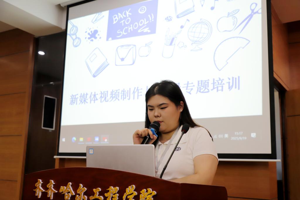 为顺应新媒体时代发展浪潮,切实提升学生新媒体创作与视频剪辑能力,帮助学生以影像记录成长,赋能自媒体账号高质量运营,9月19日,学校在图书馆601举办新媒体视频制作与剪辑专题培训。本次培训由党委宣传统战部联合信息学院共同举办,党委宣传统战部副部长王倩主持,融媒体中心于杰一主讲,各学院学生骨干及学生代表参加。