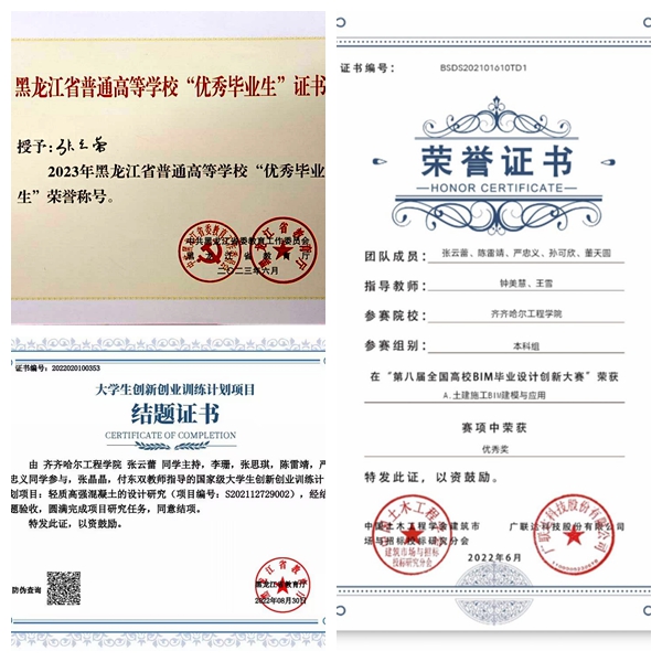 张云蕾:我在大学期间参加的比赛几乎都是与专业知识有关的团队赛,提前锻炼了团队合作能力,为以后就业打下基础。在“轻质高强混凝土设计大赛”中,我带领团队荣获一等奖;在第八届全国高校BIM毕业设计创新大赛中荣获团队优秀奖;在“大学生创新创业训练计划项目”轻质高强混凝土的设计研究中,获得了国家级结题证书。这些团队比赛极大地锻炼了我的组织能力和交流沟通能力,带领好一个团队是一件很难的事情,需要根据每位队员的特长进行分工,同时要不断进行沟通。在比赛过程中,我的团队协作能力得到了提升,同时也收获了团队之间的友情和彼此之间的信任,更重要的是我们深刻地体会到了团结协作、勇于创新和实事求是的科研精神。