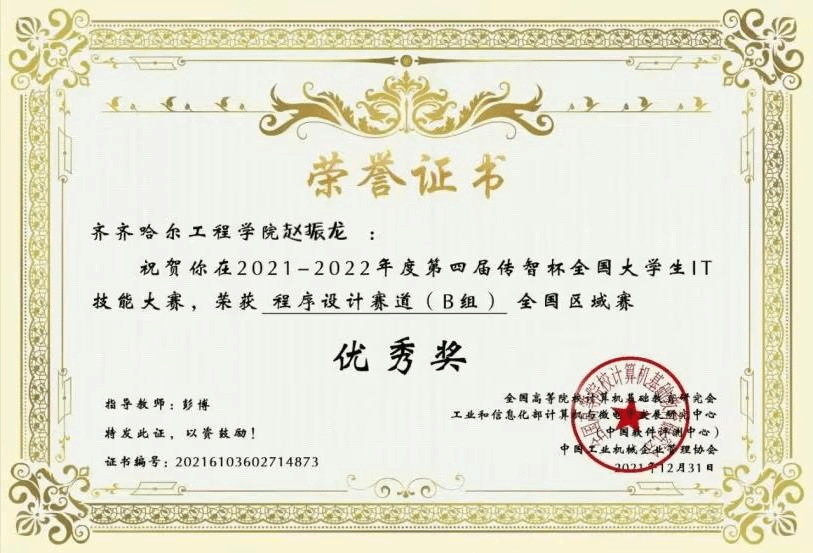 在校期间他积极参与各类校园活动,展现出卓越的组织能力和团队协作精神,曾荣获“优秀学生干部”“优秀团员”等荣誉称号,竞赛方面曾荣获第十三届蓝桥杯全国软件和信息技术专业人才大赛黑龙江赛区C/C++程序设计大赛B组三等奖、第四届传智杯全国大学生IT技能大赛全国区域赛优秀奖。