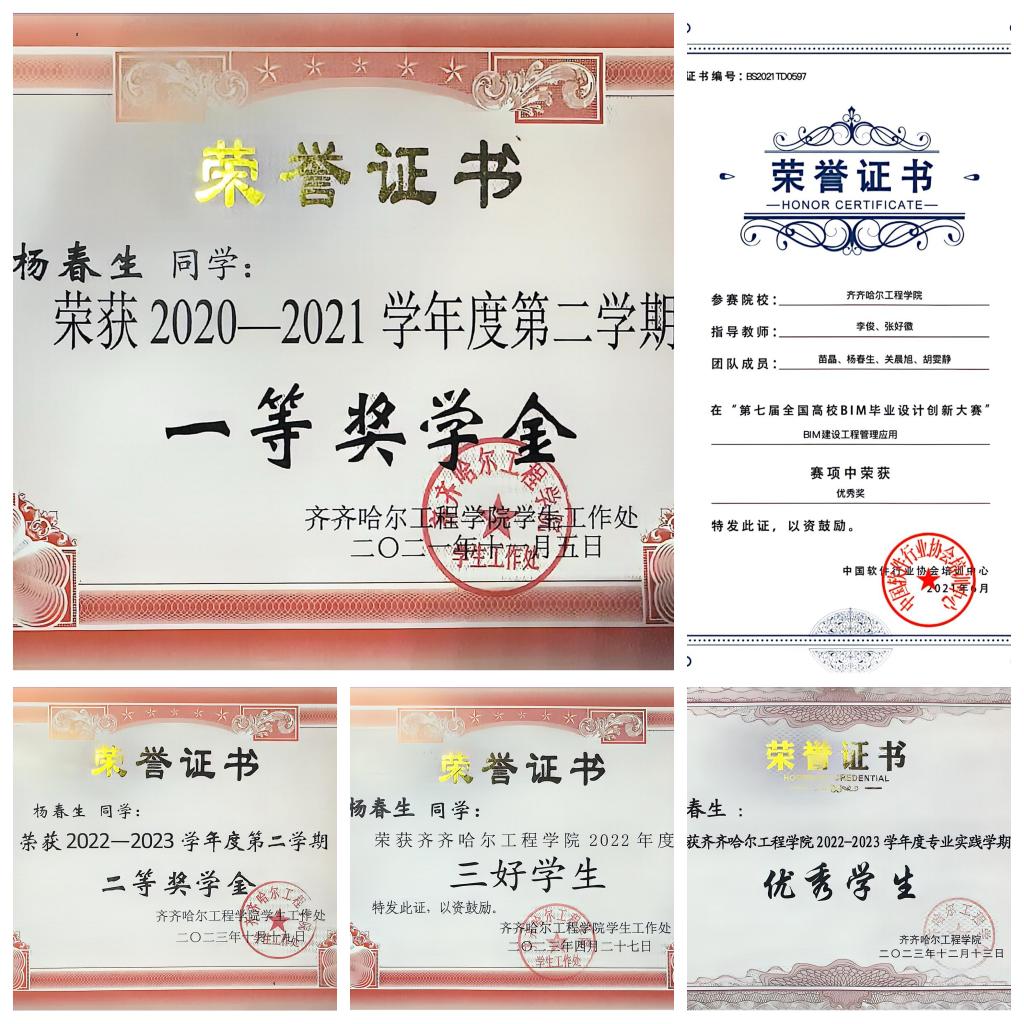杨春生,男,汉族,中共党员,2024届工程管理专业毕业生,现就业于中国能源建设集团东北电力第二工程有限公司。在校期间曾获1次校级一等奖学金、5次校级二等奖学金,2次国家励志奖学金、2024年黑龙江省“优秀毕业生”、2024年黑龙江省“三好学生”、2020-2021学年度“优秀实习生”、2021-2022学年度“社会实践优秀学生”、2021-2022学年第二学期“优秀学生教学信息员”、2021年度“优秀学生干部”、2022学年度“三好学生”等荣誉。