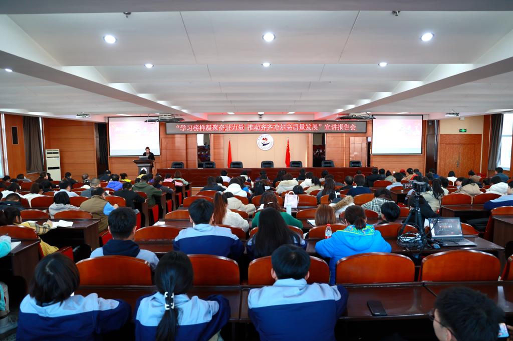 为深入学习贯彻落实党的二十大精神,大力弘扬中国共产党人精神谱系,11月7日,由市委宣传部联合市委教育工委共同开展的“学习榜样凝聚奋进力量 推动齐齐哈尔高质量发展”宣讲报告团来校开展宣讲活动。宣讲会由副院长白雪主持,报告会分为现场和线上两个会场,师生代表近200人现场聆听榜样故事,汲取前行力量。宣讲报告团由市委宣传部宣教处处长姜久军带队,中国一重水压机锻造厂副厂长刘伯鸣、齐齐哈尔市公安局刑事技术支队DNA...