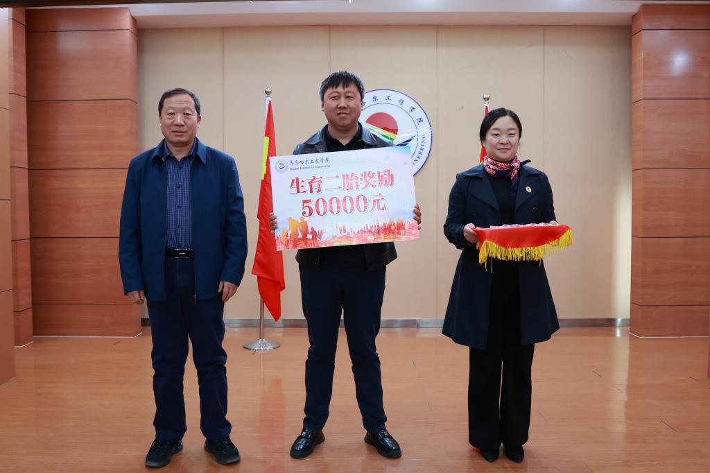 4月10下午,学校生育奖励大会在图书馆601报告厅召开。创校校长、理事长曹勇安教授出席会议并讲话。会议由学校工会副主席王丽萍主持,200余名教职工参加会议。据悉:2024年3月5日,赵婷婷在儿子七岁之时,又诞下第二胎女儿,按照学校关于生育二胎家庭奖励5万元、生育三胎家庭奖励10万元的规定,崔晓东、赵婷婷夫妇率先获得学校生育二胎奖励。院长、党委副书记曹然彬为崔晓东、赵婷婷夫妇发放生育二胎奖励5万元赵婷婷在发言中表...