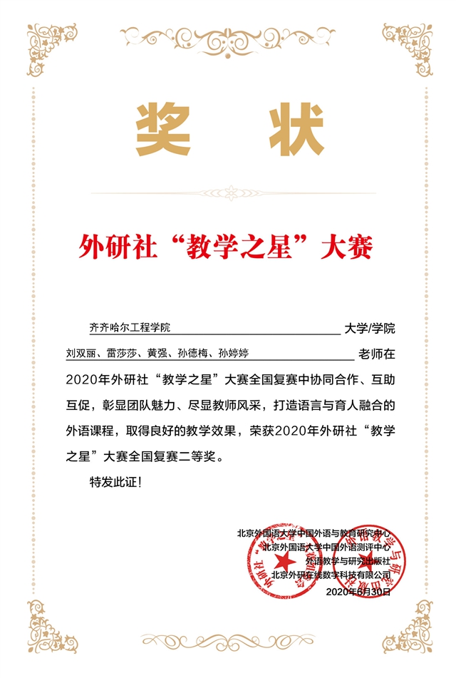 6月30日,由教育部高等学校大学外语教学指导委员会、教育部高等学校英语专业教学指导分委员会和外语教学与研究出版社共同举办的“教学之星”大赛结果揭晓,我校管理工程系由大学英语任课教师刘双丽、雷莎莎、黄强、孙...