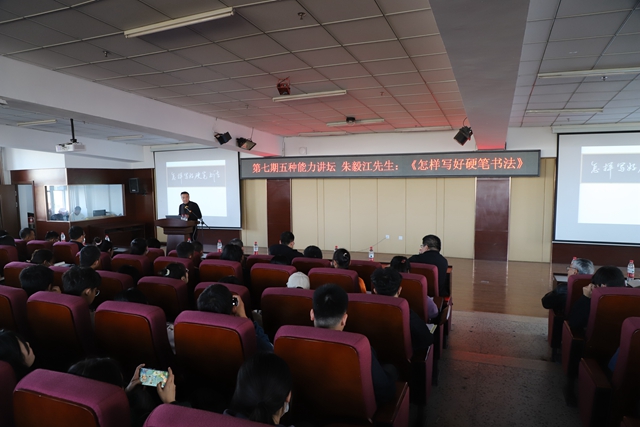 10月21日下午,第七期五种能力讲坛在图书馆501报告厅举行。我校学生汉字书写能力提升培训活动正式启动,邀请知名书法家朱毅江为培训开课,副院长张振笋、全体辅导员及各班学生代表250多人参加活动。 书法家朱毅江做...