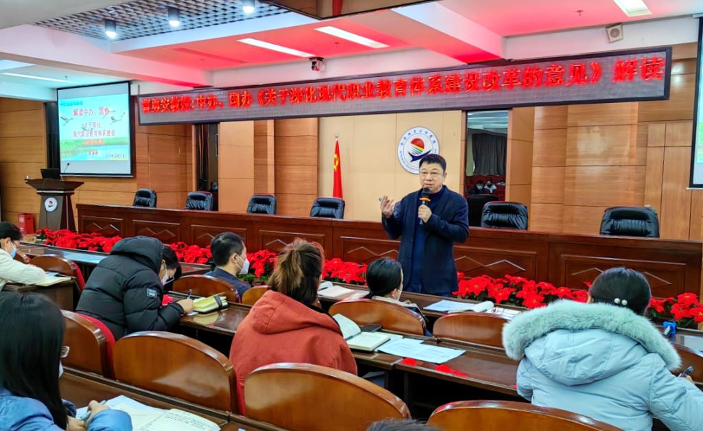 12月31日上午,《关于深化现代职业教育体系建设改革的意见》学习会在601报告厅举行,理事长曹勇安教授在对《关于深化现代职业教育体系建设改革的意见》批注阐释、推荐学习的基础上,面向学校骨干学习班成员、市区两级...