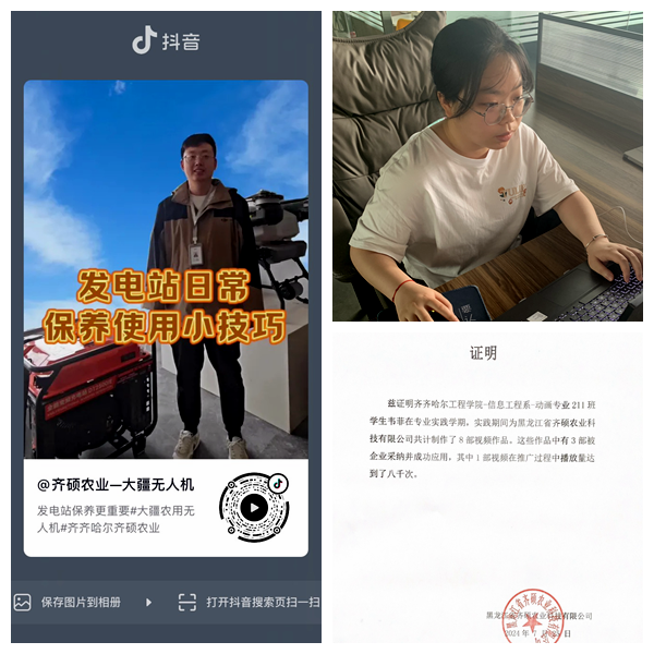 信息工程系动画专业211班韦菲同学在齐硕农业科技有限公司实习期间,现已完成8部视频的制作,其中:《大疆服务门店(一)》《大疆服务门店(二)》以及《发电站日常保养使用小技巧》因作品优秀而被公司采用,并给予1500元奖金,作为对她工作成绩的肯定和鼓励。专业实践学期,韦菲同学经专业推荐在齐硕农业科技有限公司实习,从事剪辑师岗位,为企业进行产品宣传推广视频的制作。韦菲同学主动拓展学习专业知识,解决实际工作中的...