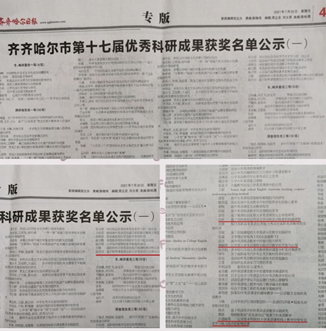 近日,齐齐哈尔市外语学会公布了第十七届优秀科研成果奖,学校共有4项成果获奖。其中,赵丹丹老师的《基于跨界课堂理论的大学英语项目式教学设计》获得论文类成果二等奖,孙德梅老师的《应用型本科院校大学英语课程线...