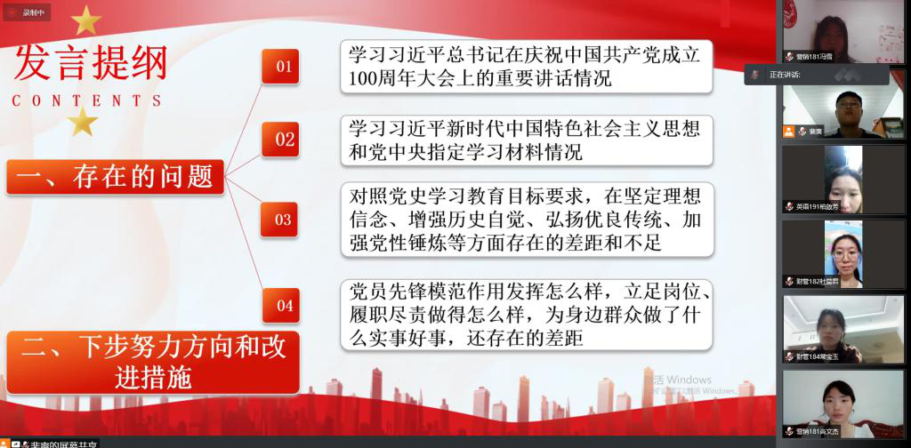 8月15日,管理专业学生党支部在腾讯会议召开党史学习教育专题组织生活会,会议由管理专业学生党支部宋玉丽老师主持,所有党员参加。 会上,支部书记刘娜剖析了在党建工作中存在的问题,并提出了改正对策,总结了学习...