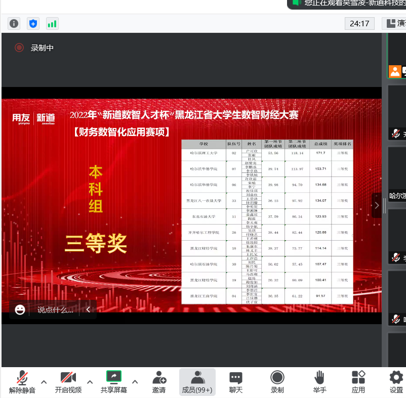 10月16日,2022年“新道数智人才杯”黑龙江省大学生数智财经大赛暨金砖国家技能发展与技术创新大赛黑龙江地区选拔赛组委会传来喜讯:我校财务管理专业韩宇航、吴琪、付晓艺、王若檀同学获本科组三等奖佳绩。 本次比赛...