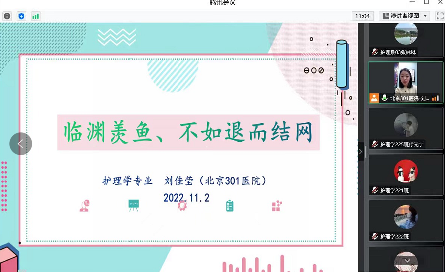 11月2日晚,护理学专业邀请学校毕业生、现就职于解放军总医院第一医学中心(北京301医院)的刘佳莹校友作《临渊羡鱼 不如退而结网》专题讲座。讲座采用腾讯会议的形式进行,全体2022级学生在教室内集中听讲。 讲座中...