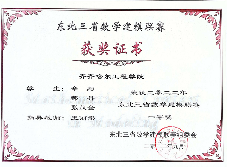 近日,2022年东北三省数学建模联赛结果揭晓,我校三个学生团队分获一、二、三奖。 奖团队队员 指导教师 获奖等级 辛颖 郝丹 张茂全 王丽影 一等奖 耿...