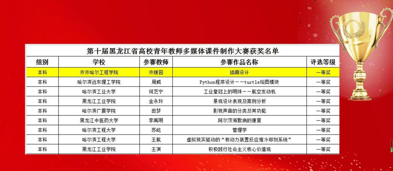 近日,黑龙江省高师培训中心公布“第十届黑龙江省高校青年教师多媒体课件制作大赛获奖名单”,我校信息工程系齐媛园老师荣获本科组一等奖。本次大赛全省共评选获奖作品73件。其中本科院校组一等奖15件、二等奖25件,高职高专组一等奖11件、二等奖22件,我校教师在大赛上获得佳绩。学校高度重视课程建设,深化教学方法和教学模式改革,积极推进现代教育技术与课堂教学的有机融合。教师发展中心以信息化教学比赛为载体,认真组织...