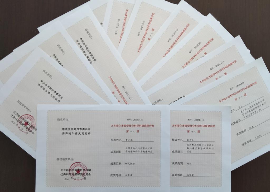 近日,由市委市政府设立的齐齐哈尔市第十八届社会科学优秀科研成果奖评选揭晓,我校12名教师的优秀科研成果获表彰。曹克晶老师获研究报告类二等奖;赵丹丹老师获论文类二等奖;齐锐、孙伟、郭慧莹、乔亚男、刘双丽、孙德梅、李爽、孙婷婷、黄强、刘欢10名教师获论文类三等奖。据悉,全市社会科学优秀科研成果奖每两年评选一次,主要表彰为本市经济社会发展进行理论研究与实践探索作出贡献的优秀成果,旨在调动和激发广大社会科...