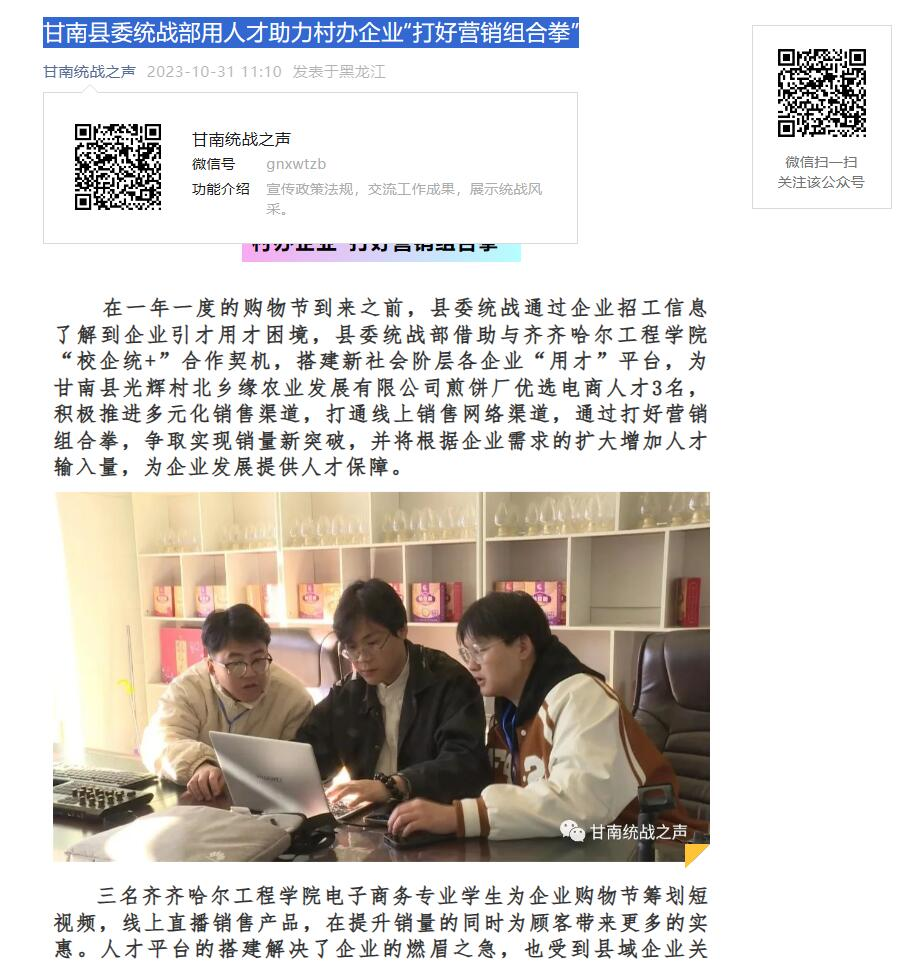 10月31日,甘南县委统战部官媒以《甘南县委统战部用人才助力-村办企业“打好营销组合拳”》为题,肯定了乐投app官方在线入口管理工程系校外课堂学生对县域经济发展的积极作用,为县域企业提质增效作出了积极贡献。新闻强调了“甘南县委统战部将主动融入县域发展大局,坚持“统战+人才”的工作新机制,优化营商环境,围绕电商和农副产品深加工发掘人才,为企业解决人才短缺的困境,助力乡村振兴。与此同时,校外课堂的创新又为高...