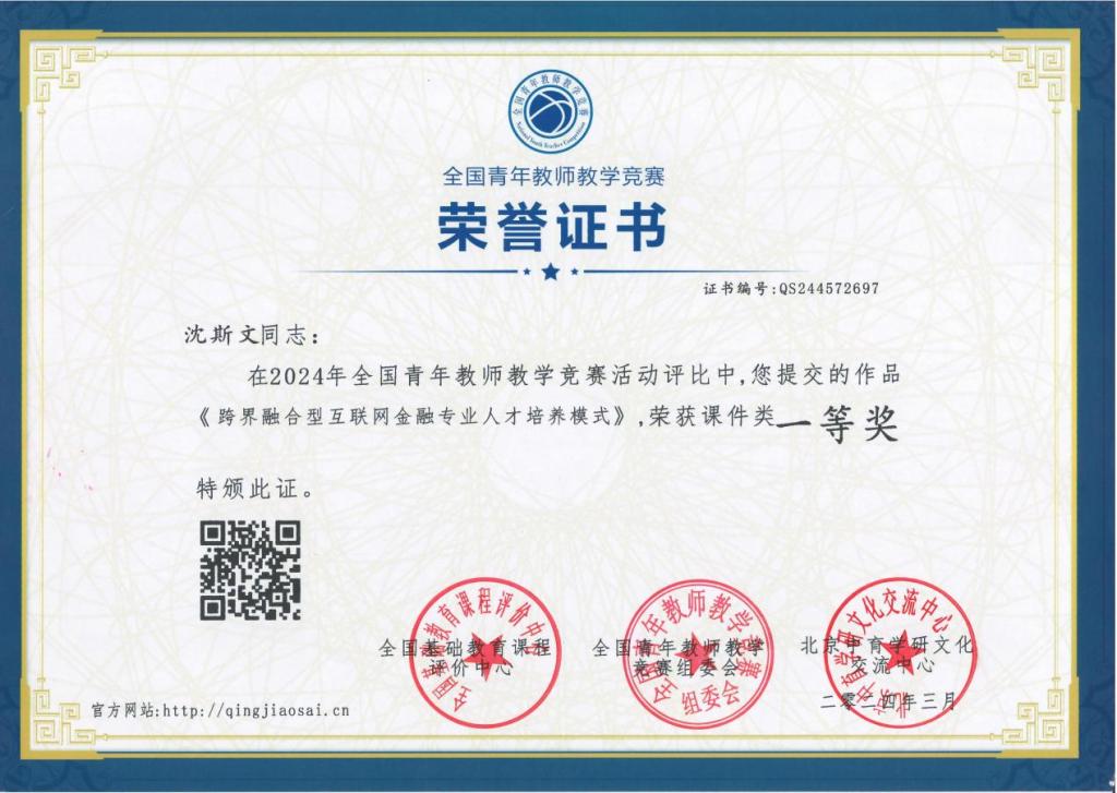 近日,2024年全国青年教师教学竞赛组委会传来喜讯,管理工程系互联网金融专业沈斯文老师荣获课件类一等奖、教学设计类二等奖,王玉洁老师荣获课件类一等奖。本次大赛由北京中育学研文化交流中心主办,全国基础教育课程评价中心评审,全国青年教师教学竞赛组委会组织开展。据悉,本次大赛得到全国院校及广大一线教师的大力支持和积极参与。沈斯文、于红岩在备赛期间,围绕竞赛选题要求为专业教师开展了集中备课指导。此次参赛,...