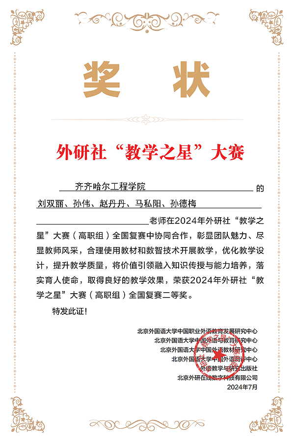 近日,2024年外研社“教学之星”大赛全国复赛落下帷幕,学校基础部大外教研室教师喜获佳绩。本科组中团队教师曹献玲、刘欢、李爽、徐怡、鹿惠敏荣获本科组全国复赛二等奖。高职组中团队教师刘双丽、孙伟、赵丹丹、马私阳、孙德梅荣获高职组全国复赛二等奖。本届“教学之星”大赛以“外语教材的有效使用:数智赋能 创新育人”为主题,此次获奖不仅是对学校教师个人能力的肯定,更是对学校教育教学工作的鼓励与鞭策。在今后的教学...