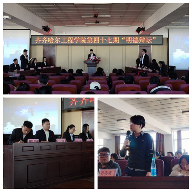 11月15日中午,由学院团委主办、学生民主管理委员会承办的第四十七期“明德辩坛”辩论赛在图书馆501报告厅举行。 此次辩论赛的正方代表队由管理工程系财管192班孙雨欣、财管192班侯佳琪、财管194班李烁、财管192班胡...