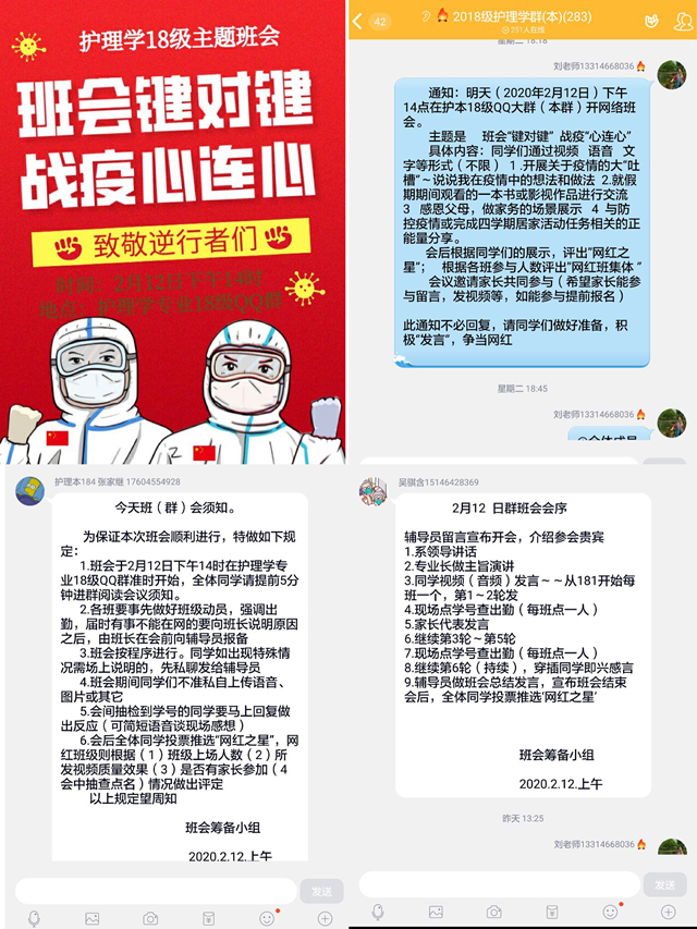 为引导学生们正确对待新冠肺炎疫情,增强抗击疫情的信心,同时有意义地度过后续居家时间,给下一步可能展开的网络教学打基础、做准备,2月12日下午,健康与护理系护理学专业通过QQ群召开2018级“班会键对键 战疫心连心...