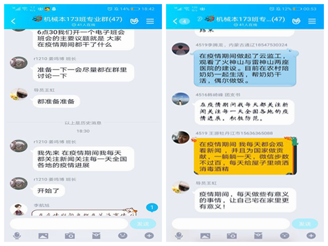 2月13日,机电工程系辅导员王虹老师和机械本173班班长姜鸣博,通过班级QQ群召开以“抗疫同心同行 我为疫情作贡献”主题网络班会。王虹老师强调,同学们对疫情要重视起来,关心自己、关爱家人,每天做些有意义的事情,...