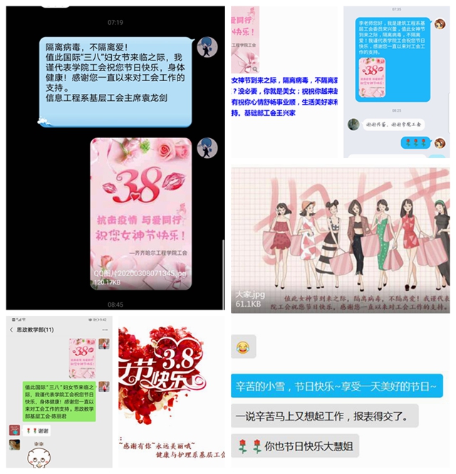 3月8日,在“三八”国际劳动妇女节到来之际,学校工会对在疫情防控期间依然奋战在教育教学战线的全体女教职工致以诚挚的节日问候! 学校工会在制作精美的图片上写上诚挚的节日问候祝福,通过QQ、微信等媒体平台送传至...